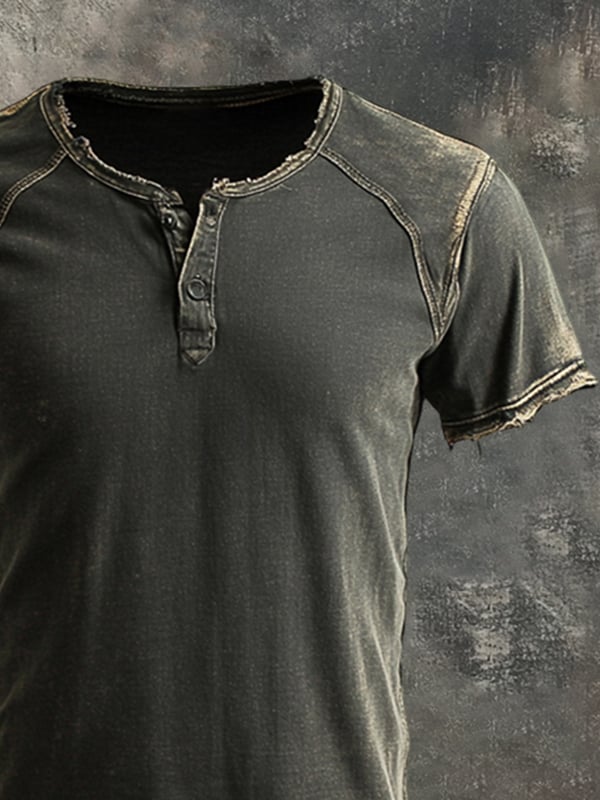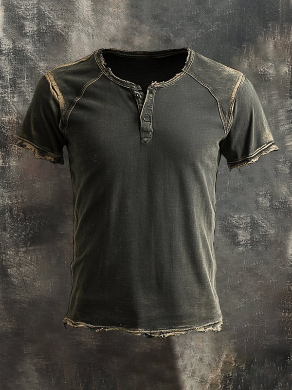 Men's Vintage Distressed Colorblock Casual Henley Short Sleeve T-Shirt