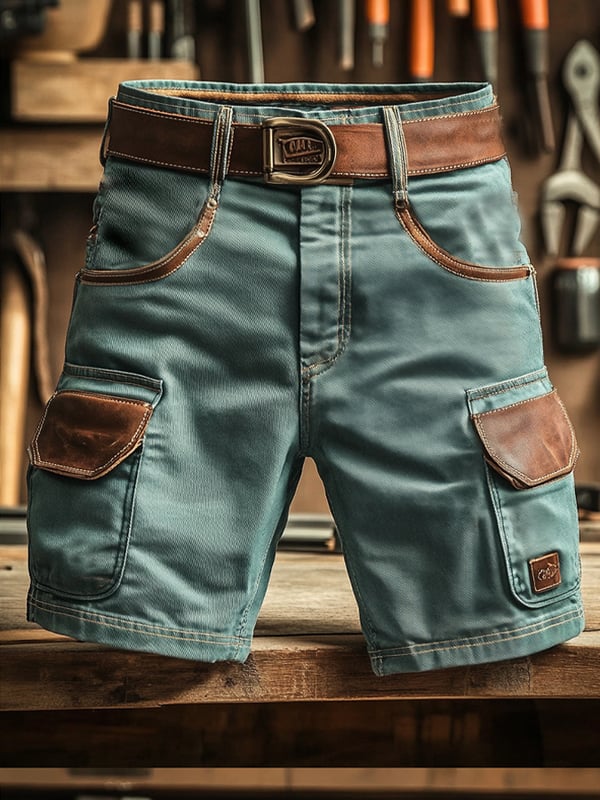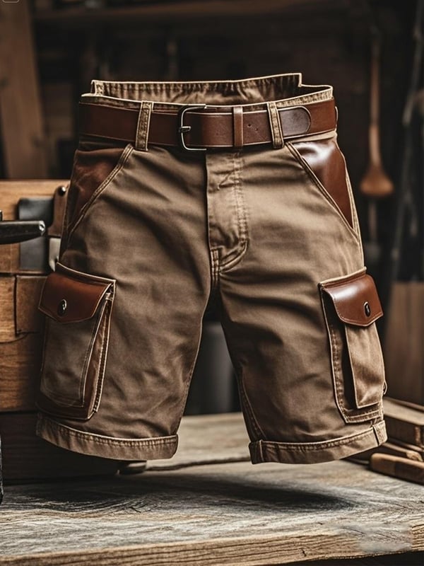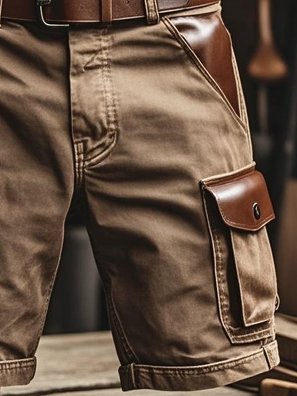Men's Vintage Outdoor Suede Patchwork Bags Functional Work Shorts