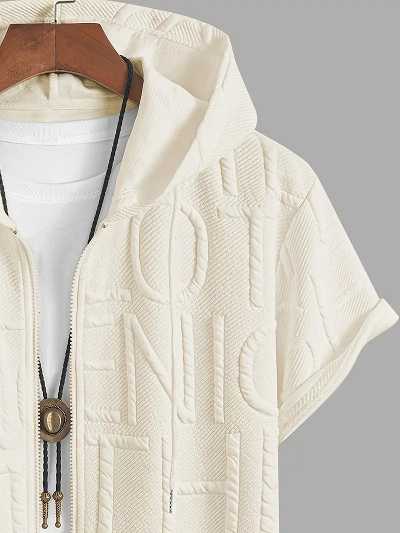 ✅Modern Textured Look: The Henryk Elegant Short Sleeve Hooded Jacket features a unique embossed letter pattern that adds depth and character to your style. Its short-sleeve cut keeps it trendy and perfect for casual outings. The design blends fashion and comfort effortlessly, making it a standout choice for any wardrobe.