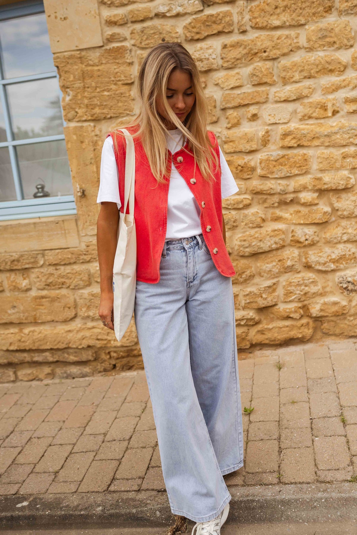 Modern, uncomplicated, and perfect for warm days—the Lina summer vest brings a breath of fresh air to your wardrobe with its bold red color and slightly washed-out look. The decorative buttons and casual cut make it the perfect layering piece over T-shirts or tops—versatile enough to wear from spring to fall.