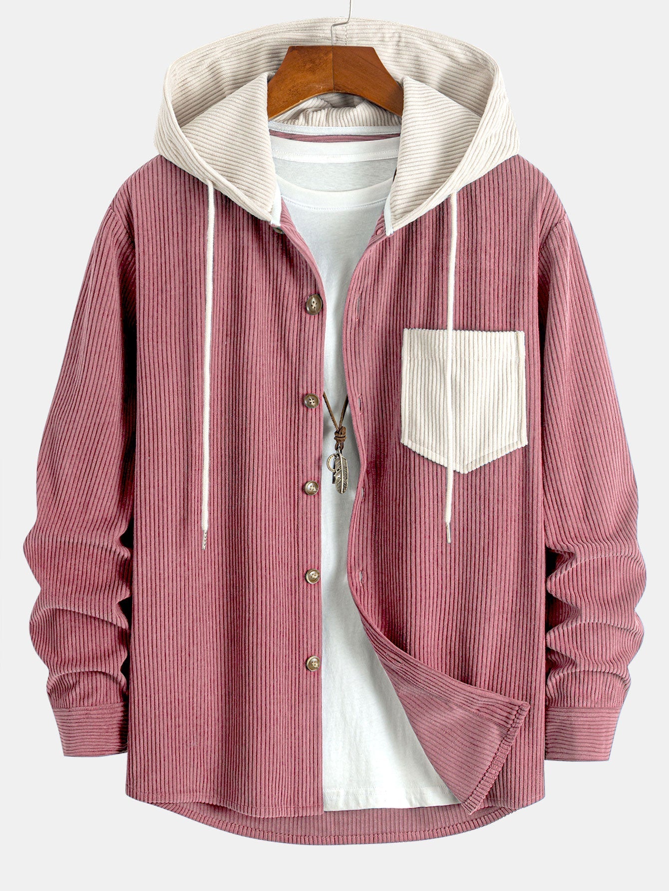 This casual hooded shirt is made from corduroy fabric and has a soft, vintage look. The hood and chest pockets are finished with off-white corduroy, which contrasts strikingly with the main body and adds a sense of layering and design. Perfect for everyday wear or vacations in spring and fall, it combines comfort and style.